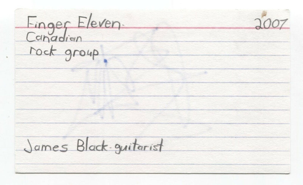 Up for sale is an autographed 3x5 index card, boldly signed by James Black, of the band Finger Eleven. This autograph was part of an enormous collection of over 9000 in person collected signatures.