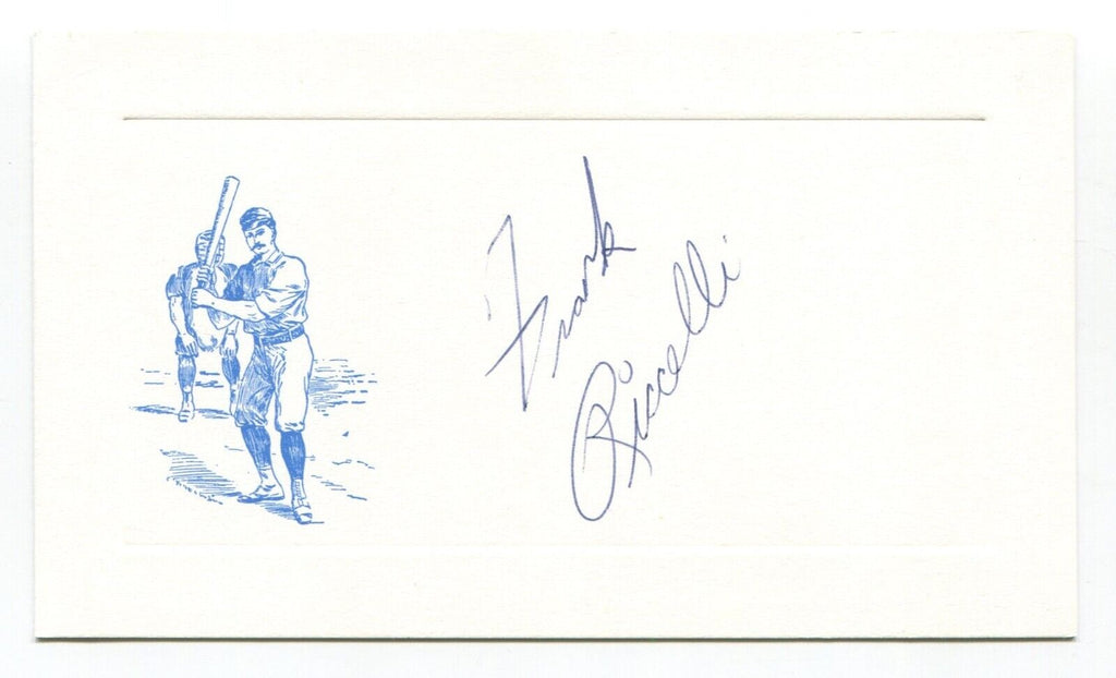 Up for sale is an autographed approximately 3.5 x 5.5 inch card, boldly signed by baseball player Frank Riccelli. Just a great looking autograph that will display nicely. Autograph was acquired by renowned autograph collector Roger Harris.