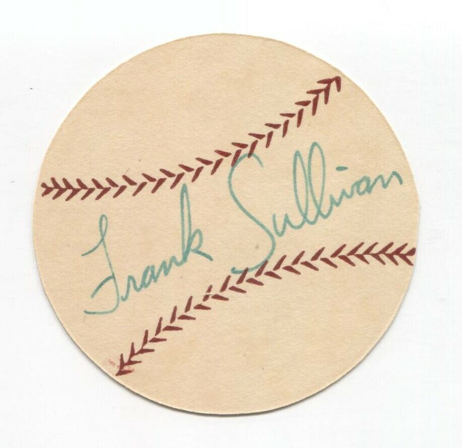 Up for sale is a signed thick paper stock baseball measuring approximately 2.5 inches in diameter, featuring an autograph of Frank Sullivan. The third scan (not included with the item) shows the original mailing envelope the signature was received in, postmarked from 1953. This autograph was part of a large collection of over 700 vintage baseball autographs and memorabilia, all obtained between 1952 and 1954 by the same original owner.