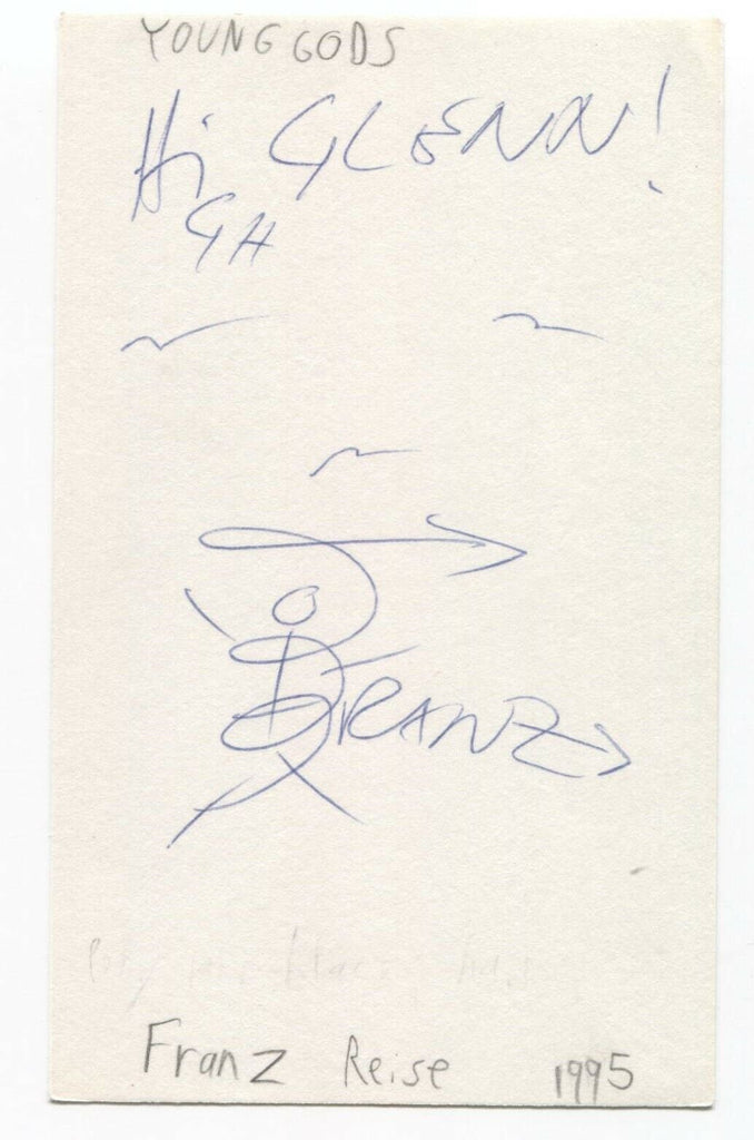 Up for sale is an autographed 3x5 index card, boldly signed by Franz Treichler, of the Young Gods. Autograph was part of an enormous collection of over 9000 in person collected signatures.