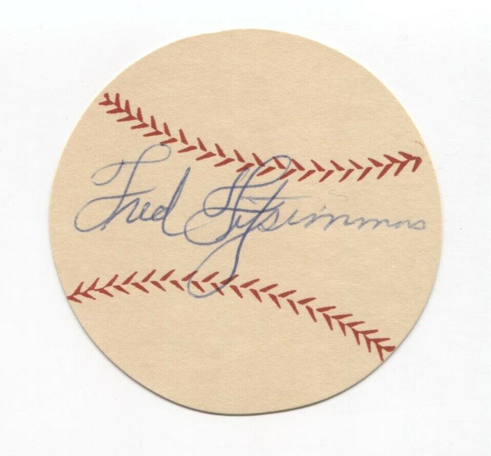 Up for sale is a signed thick paper stock baseball measuring approximately 2.5 inches in diameter, featuring an autograph of Freddie Fitzsimmons.  The third image (not included with the item) shows the original mailing envelope the autograph was received in, postmarked from 1953.  This autograph was part of a large collection of over 700 vintage baseball autographs and memorabilia, all obtained between 1952 and 1954 by the same original owner.