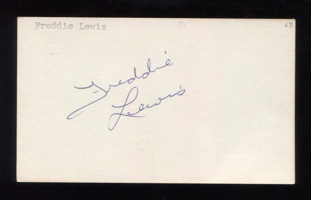 Up for sale is a 3x5 index card signed by Freddie Lewis. Boldly signed in blue ink pen on the index card, this will be a great example to matte and frame with a vintage photo. Autograph was obtained circa the 1970's by an autograph collector whose collection I purchased in it's entirety.