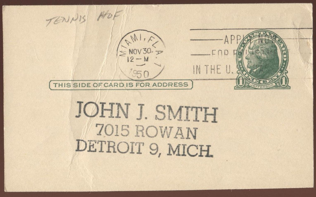 Gardnar Mulloy Signed 1950 GPC Postcard Index Autographed Tennis Hall of Fame
