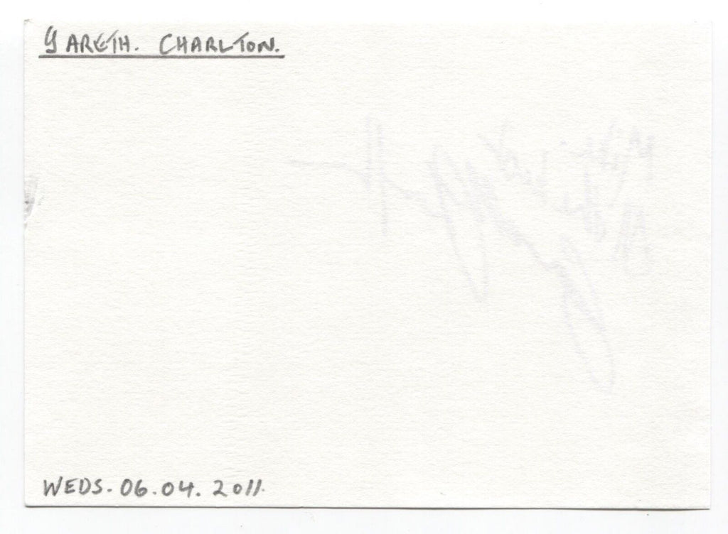 Originating from the "Michael Berry" autograph collection, this thick white paper page features a bold and clear purple pen autograph of Gareth Charlton. Page itself measures approximately 5.5 x 4 inches in size.