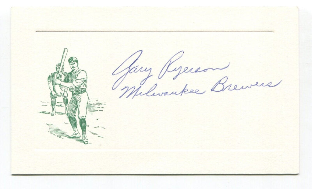 Up for sale is an autographed approximately 3.5 x 5.5 inch card, boldly signed by baseball player Gary Ryerson. Just a great looking autograph that will display nicely.   Autograph was acquired by renowned autograph collector Roger Harris.