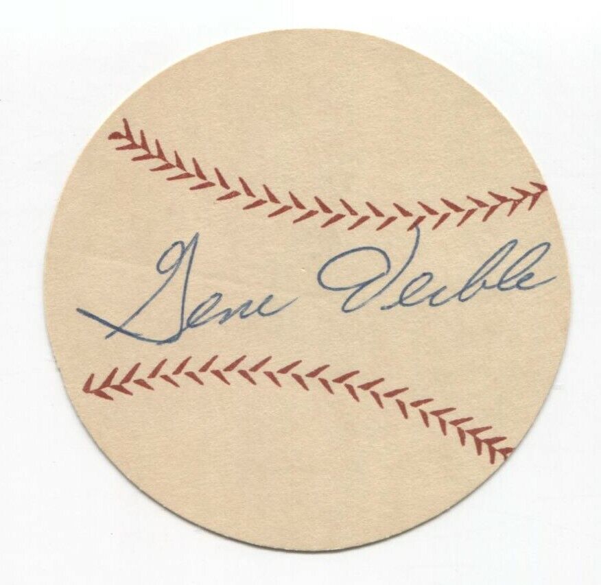 Up for sale is a signed thick paper stock baseball measuring approximately 2.5 inches in diameter, featuring an autograph of Gene Verble. The third scan (not included with the item) shows the original mailing envelope the signature was received in, postmarked from 1953.  This autograph was part of a large collection of over 700 vintage baseball autographs and memorabilia, all obtained between 1952 and 1954 by the same original owner.