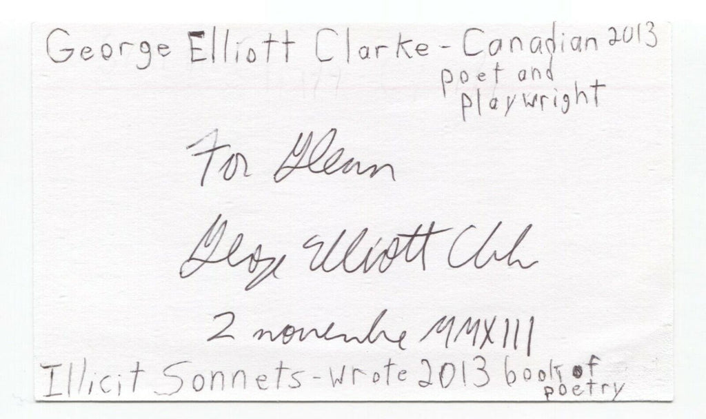Up for sale is an autographed 3x5 index card, boldly signed by author George Elliott ClarkeThis autograph was part of an enormous collection of over 9000 in person collected signatures.