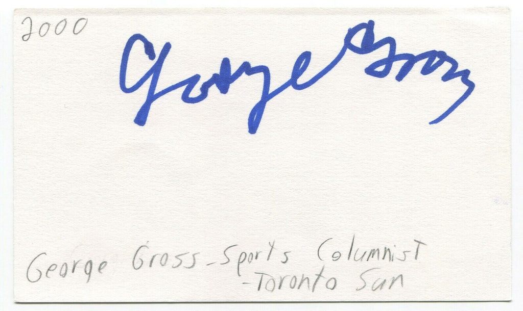 Up for sale is an autographed 3x5 index card, boldly signed by journalist and member of the Hockey Hall of Fame, George Gross.  Autograph was part of an enormous collection of over 9000 in person collected signatures.
