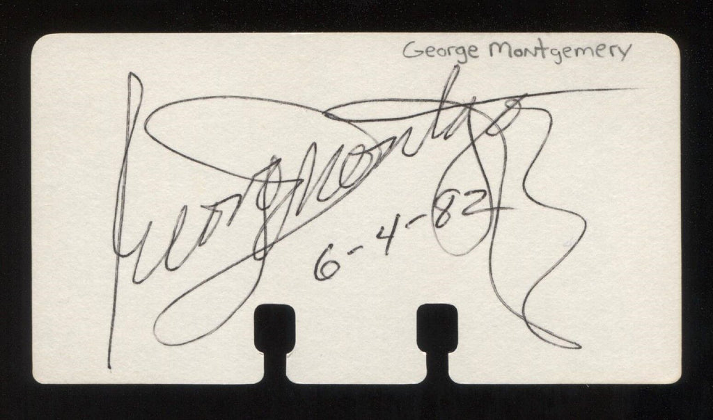 Up for sale is a nice looking vintage autograph of the great George Montgomery, signed boldly in blackink pen.   Autograph is on a thicker rolodex card, measuring approximately 4 x 2.25 inches in size.  Great vintage example of his signature that would matte and frame up nicely with a classic photograph.  Autograph is dated by Montgomery with the date he signed it, June 4, 1982.