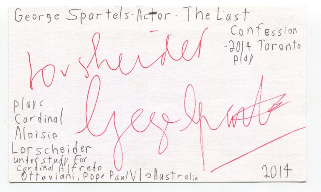 Up for sale is an autographed 3x5 index card, boldly signed by actor George Spartels. This autograph was part of an enormous collection of over 9000 in person collected signatures, all acquired in person by the great Glenn Marshall.