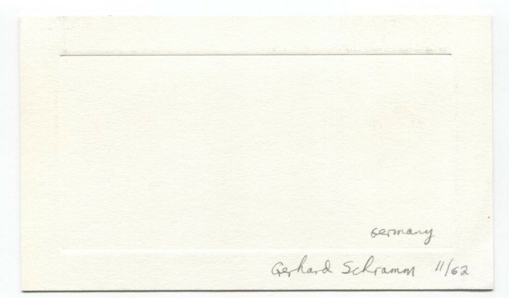 Up for sale is a signed approximately 5.5 x 3.5 inch thick paper card, boldly autographed by Gerhard Schramm. Autograph was part of the well known single owner, original "Roger Harris" collection of thousands of autographs, acquired over many decades of collecting.