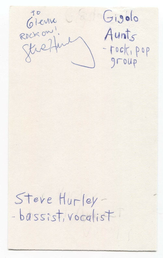 Up for sale is an autographed 3x5 index card, boldly signed by Steve Hurley, of Gigolo Aunts. Autograph was part of an enormous collection of over 9000 in person collected signatures.