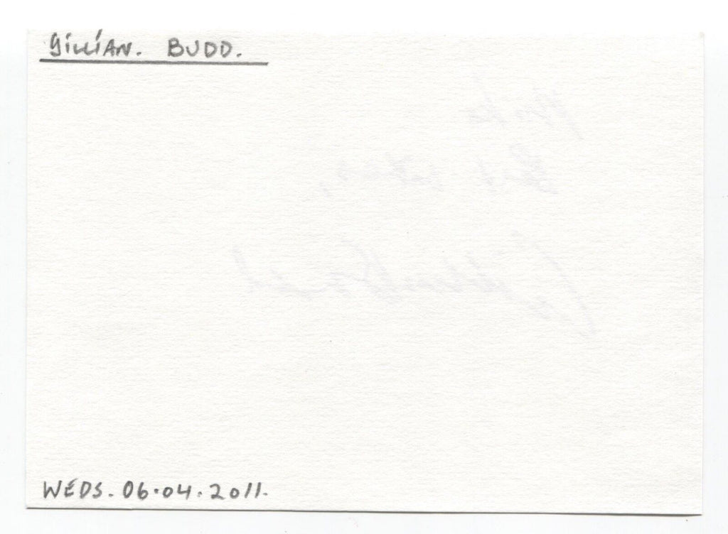 Originating from the "Michael Berry" autograph collection, this thick white paper page features a bold and clear purple pen autograph of Gillian Budd.  Page itself measures approximately 5.5 x 4 inches in size.