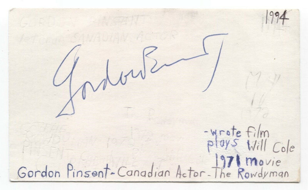 Up for sale is an autographed 3x5 index card, boldly signed by actor Gordon Pinsent. This autograph was part of an enormous collection of over 9000 in person collected signatures.