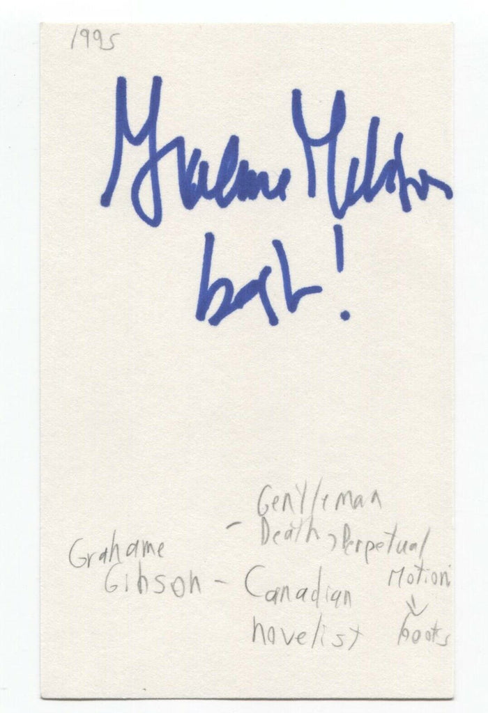 Up for sale is an autographed 3x5 index card, boldly signed by novelist Graeme Gibson.
