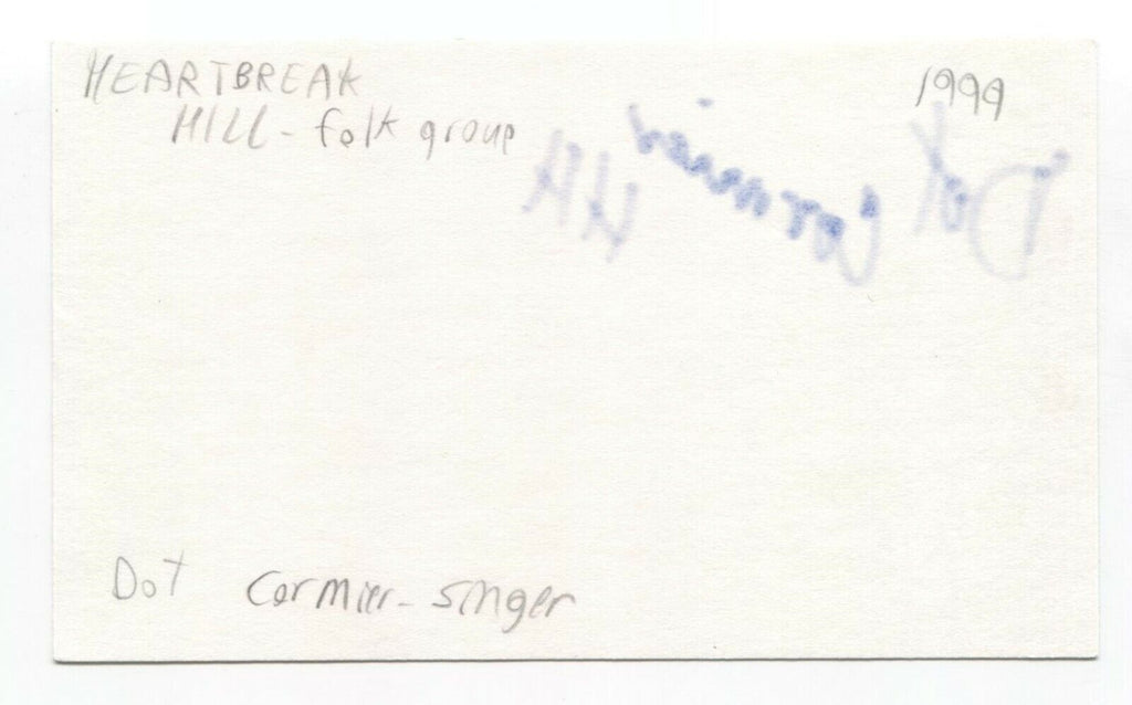 Up for sale is an autographed 3x5 index card, boldly signed by Dottie Cormier, of the band Heartbreak Hill.  This autograph was part of an enormous collection of over 9000 in person collected signatures.