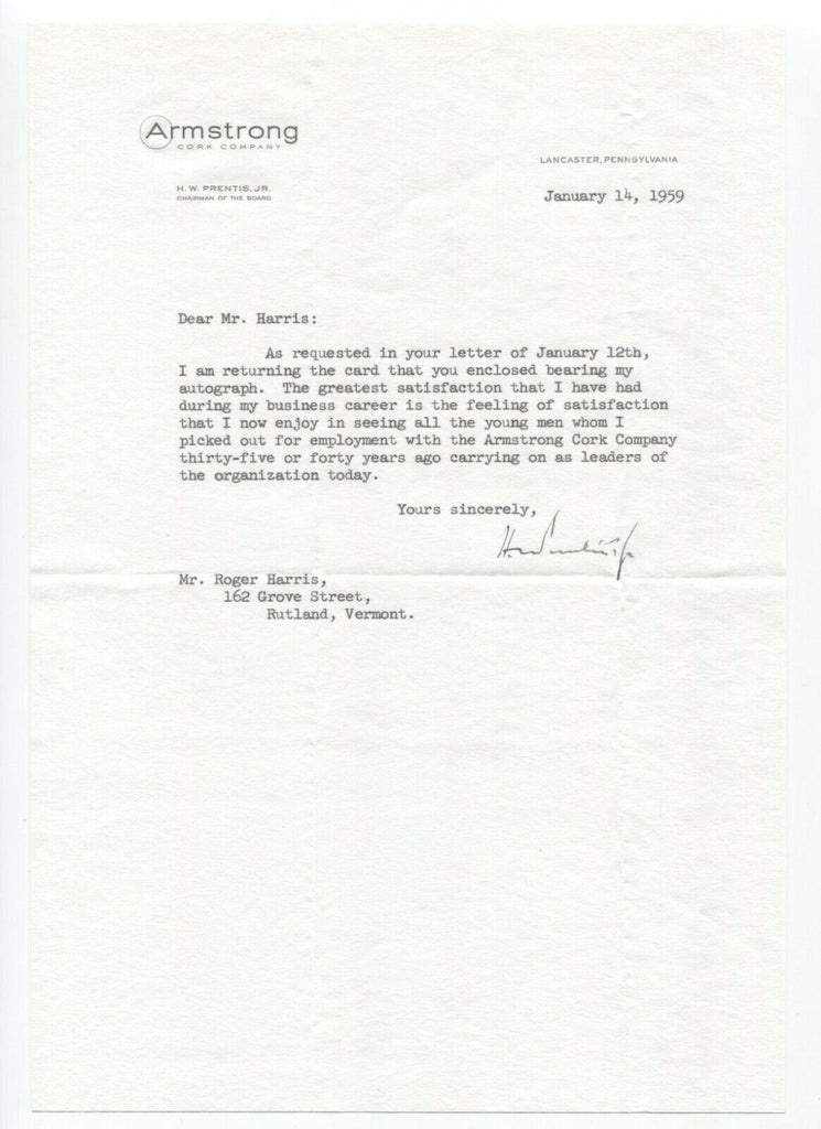 Up for sale is a signed letter, boldly autographed by businessman Henning Webb Prentis Jr.  Autograph was part of the well known single owner, original "Roger Harris" collection of thousands of autographs, acquired over many decades of collecting.