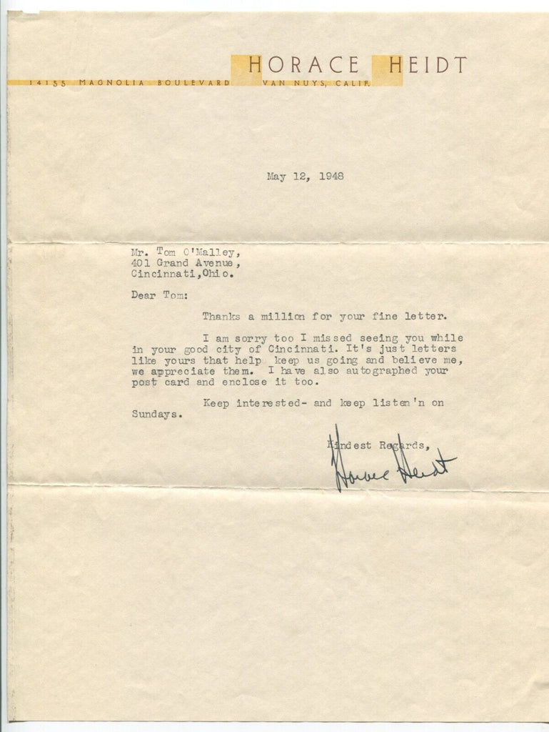 Up for sale is an autographed letter from 1948, boldly signed by pianist Horace Heidt. Just an absolutely beautiful signature, on a vintage letter. Also includes the original mailing envelope it was received in, shown in the third scan The autograph originates from the "O'Malley" collection, which encompasses over 200 total signatures. Over the coming weeks, we will be listing the autographs in this collection for sale individually, and there are some truly stellar names and real rarities. We will be listing autographs of Jim Thorpe, John Wayne, Larry Fine, Lou Costello, Bud Abbott, Peter Lorre, Lionel Barrymore, Chico Marx, and many many more. There are many uncommon names from Hollywood in the 1940's and 1950's, with scarce examples of actors from the great films It's a Wonderful Life, Casablanca, and many of the era's Wester films, etc. This collection is 100% authenticity guaranteed by our company Authentic Trading Post, which we stand behind. Please save us as a seller to follow along and keep an eye out for these autographs in the coming weeks. If you have a specific autograph want list with some tough names that you have been hunting for, I can take a look at see if we have them and get those ones listed for sale soon.