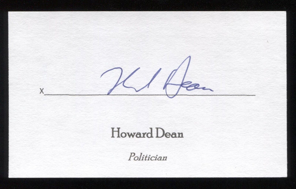 Up for sale is a signed 3x5 index card boldly autographed by Howard Dean.  Beautifully signed in ink pen, this will be a great example to matte and frame with a vintage photo.    Signature was obtained by an autograph seeker whose collection I purchased in it's entirety.