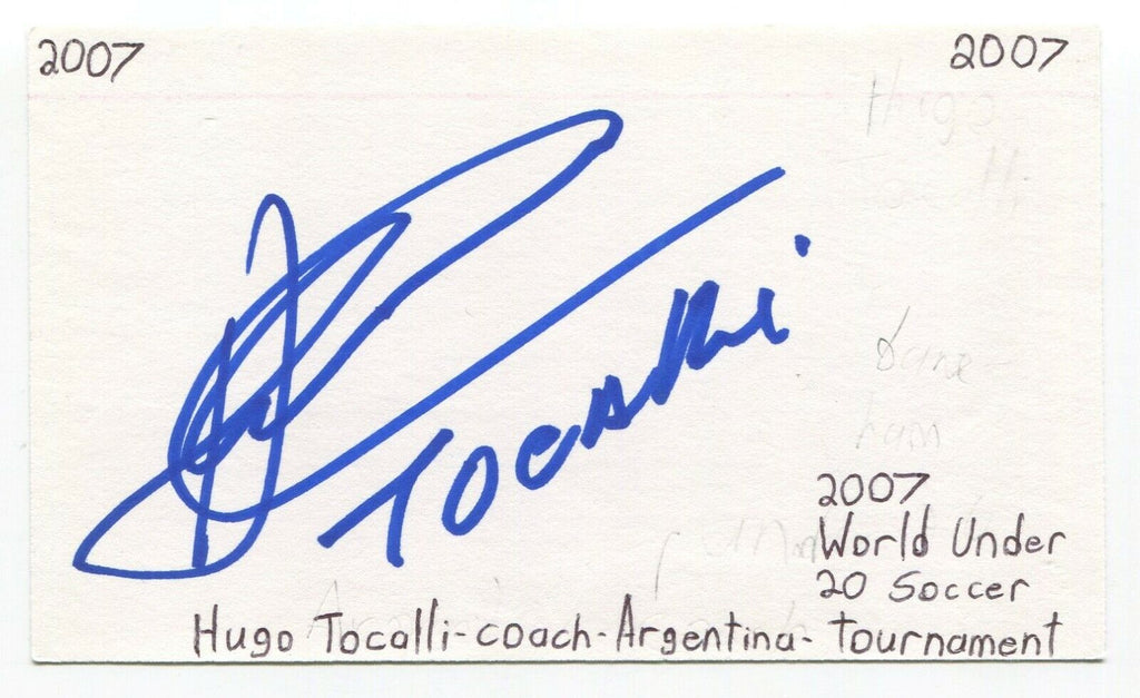 Up for sale is an autographed 3x5 index card, boldly signed by Argentine soccer star and coach, Hugo Tocalli. This one was signed from super early in his career, being autographed in 2007. Autograph was part of an enormous collection of over 9000 in person collected signatures.