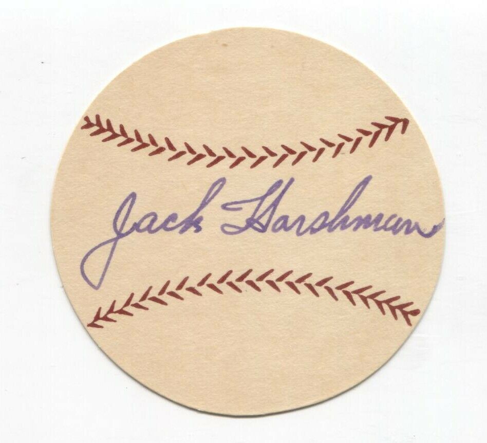 Up for sale is a signed thick paper stock baseball measuring approximately 2.5 inches in diameter, featuring an autograph of Jack Harshman. The third image (not included with the item) shows the original mailing envelope the autograph was received in, postmarked from 1953. This autograph was part of a large collection of over 700 vintage baseball autographs and memorabilia, all obtained between 1952 and 1954 by the same original owner.
