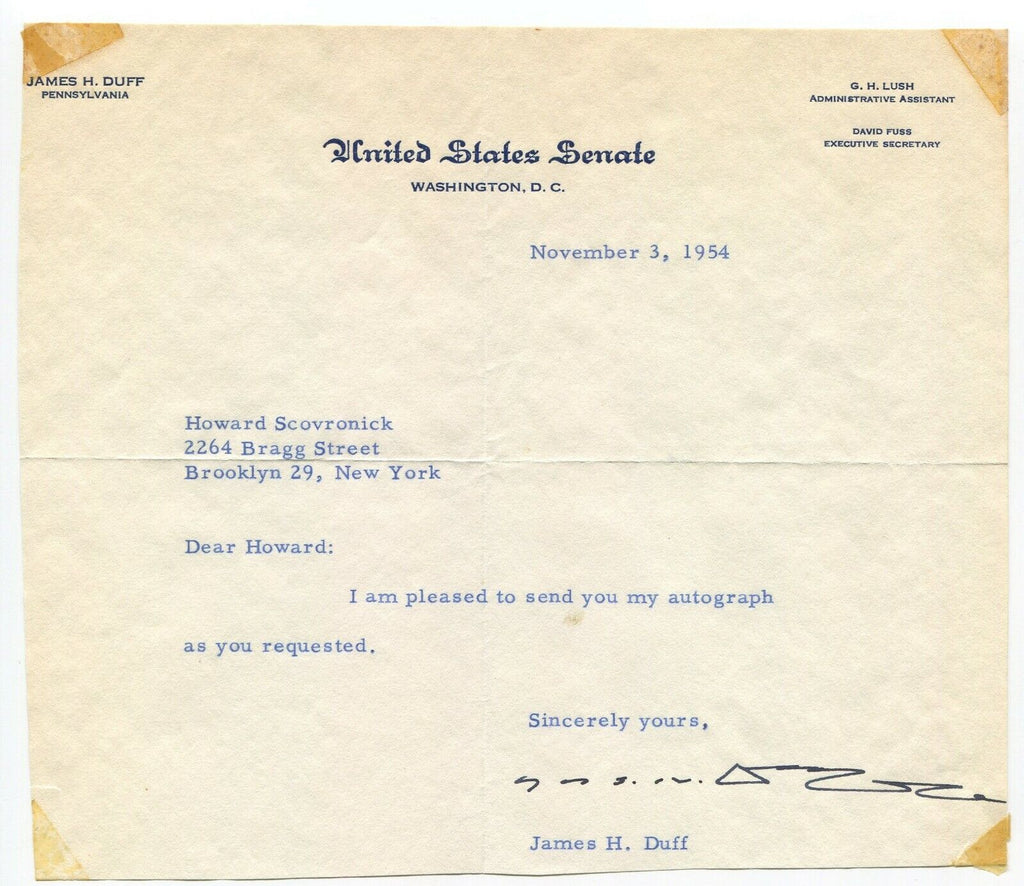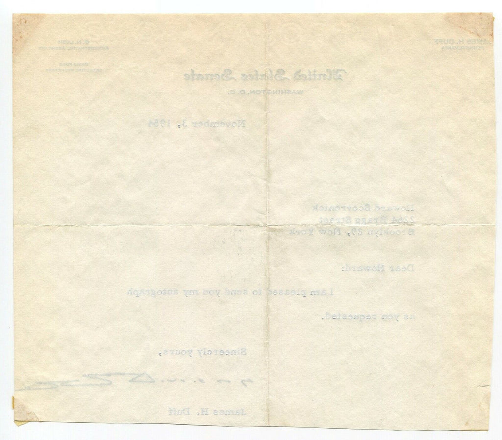 Up for sale is an autographed letter, boldly signed by politician James H. Duff. The autograph was part of a collection of over 100 political and newspaper signatures that I purchased together.