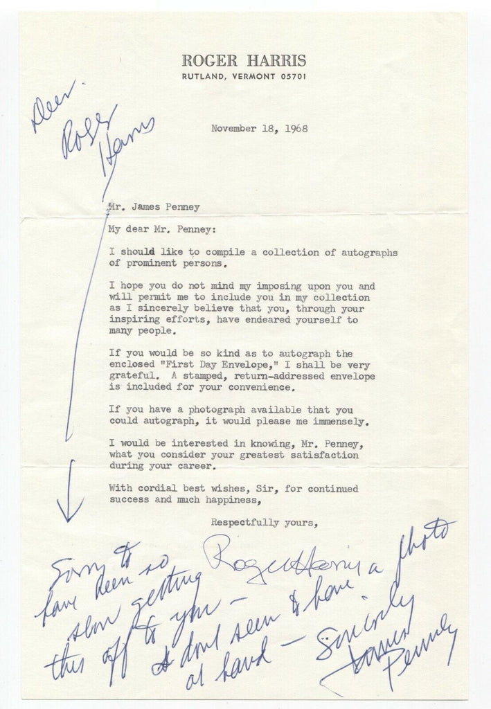 Up for sale is a signed letter, boldly autographed by artist James Penney.  Autograph was part of the well known single owner, original "Roger Harris" collection of thousands of autographs, acquired over many decades of collecting.