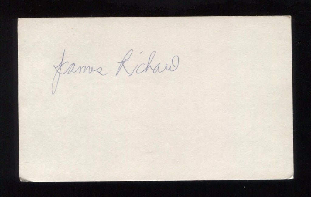 Up for sale is a 3x5 index card signed by James Richard. Boldly signed in blue ink pen on the index card, this will be a great example to matte and frame with a vintage photo. Autograph was obtained circa the 1970's by an autograph collector whose collection I purchased in it's entirety.