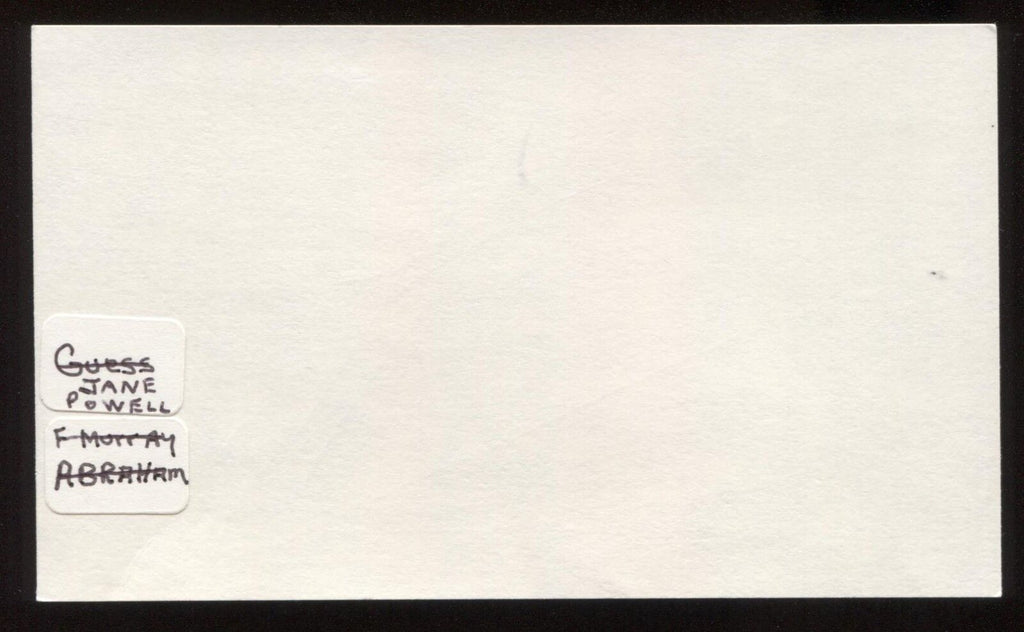 Up for buy it now or best offer is a 3x5 index card signed by Jane Powell, obtained through the mail circa 1993.  Beautifully signed in black ink pen, this will be a great example to matte and frame with a vintage photo.    Autograph was obtained through the mail in the early 1990's, by an autograph collector whose collection I purchased in it's entirety.