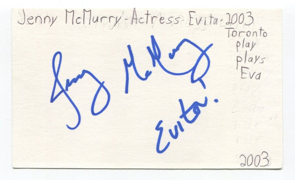 Up for sale is an autographed 3x5 index card, boldly signed by actor Jenny McMurray. This autograph was part of an enormous collection of over 9000 in person collected signatures, all acquired in person by the great Glenn Marshall.