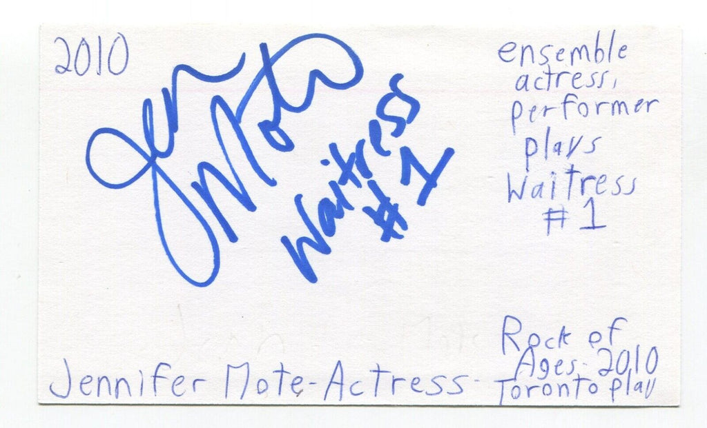 Up for sale is an autographed 3x5 index card, boldly signed by actress Jennifer Mote. This autograph was part of an enormous collection of over 9000 in person collected signatures, all acquired in person by the great Glenn Marshall.
