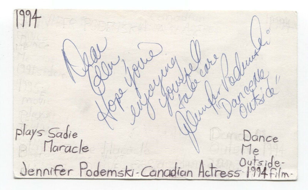 Up for sale is an autographed 3x5 index card, boldly signed by actress Jennifer Podemski. This autograph was part of an enormous collection of over 9000 in person collected signatures.