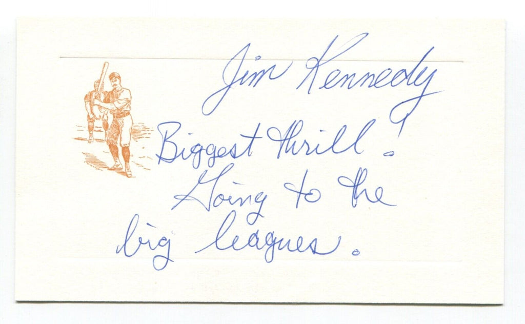 Up for sale is an autographed approximately 3.5 x 5.5 inch card, boldly signed by baseball player Jim Kennedy. Just a great looking autograph that will display nicely. Autograph was acquired by renowned autograph collector Roger Harris.