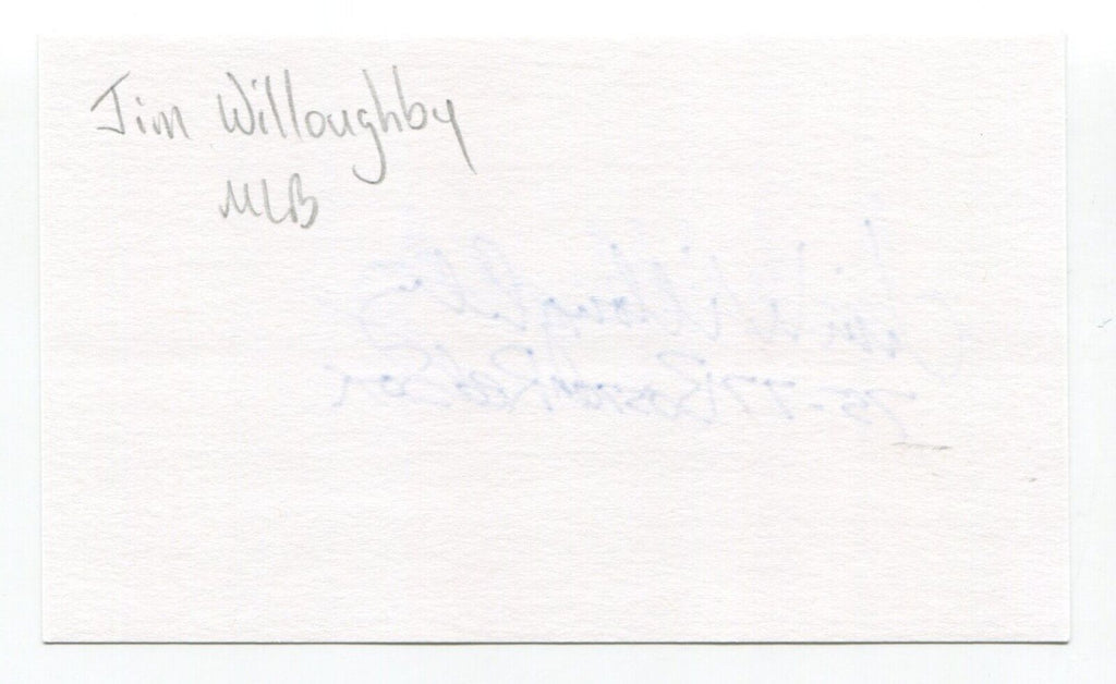 Up for sale is an autographed 3x5 index card, boldly signed by baseball player Jim Willoughby. Just a great looking autograph that will display nicely. Autograph was part of a huge "MP" Collection, consisting of over 3,000 signed index cards that I was fortunate to purchase in it's entirety.