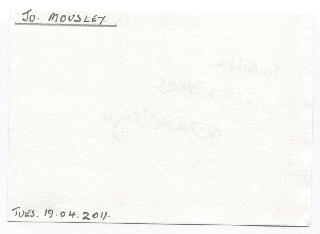 Originating from the "Michael Berry" autograph collection, this thick white paper page features a bold and clear purple pen autograph of Jo Mousley. Page itself measures approximately 5.5 x 4 inches in size.