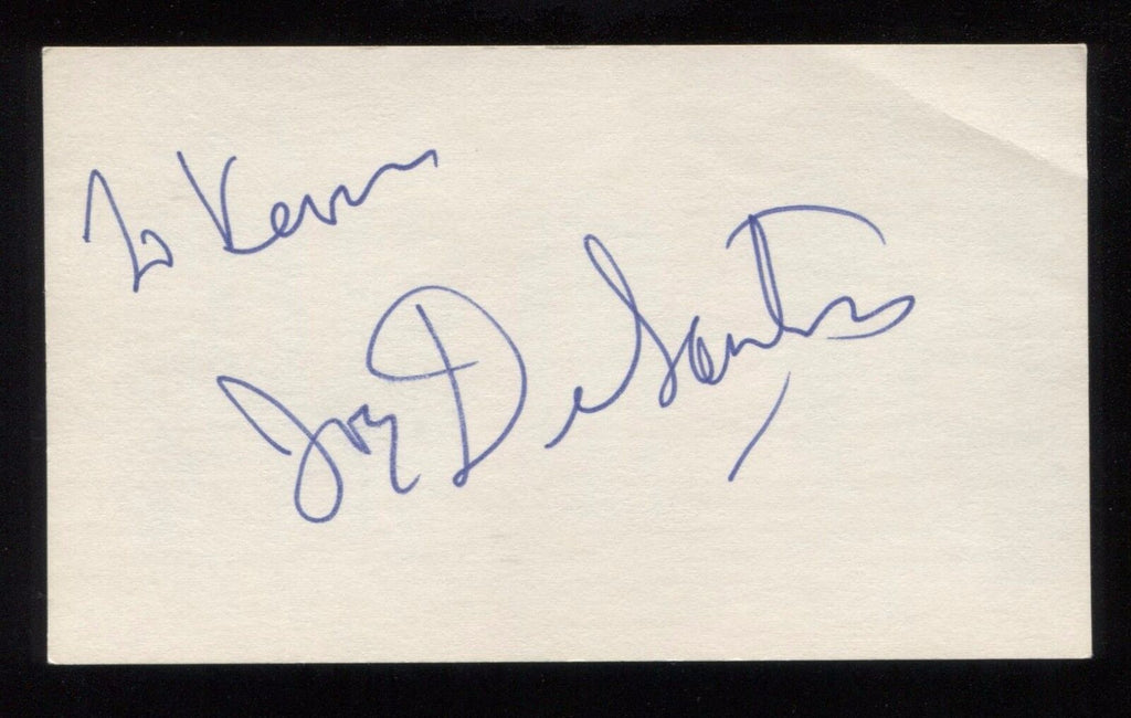 Up for sale is a 3x5 index card signed by Joe DeSantis. Boldly signed in blue ink pen on the index card, this will be a great example to matte and frame with a vintage photo. Autograph was obtained circa the 1970's by an autograph collector whose collection I purchased in it's entirety.