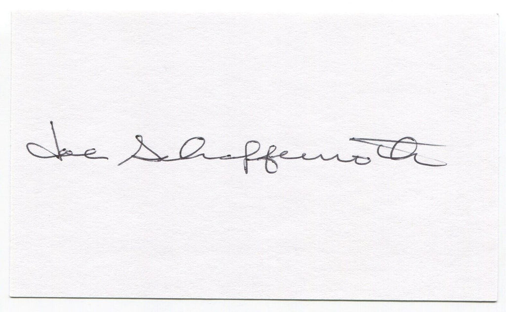 Up for sale is an autographed 3x5 index card, boldly signed by baseball player Joe Schaffernoth. Just a great looking autograph that will display nicely. Autograph was part of a huge "MP" Collection, consisting of over 3,000 signed index cards that I was fortunate to purchase in it's entirety.