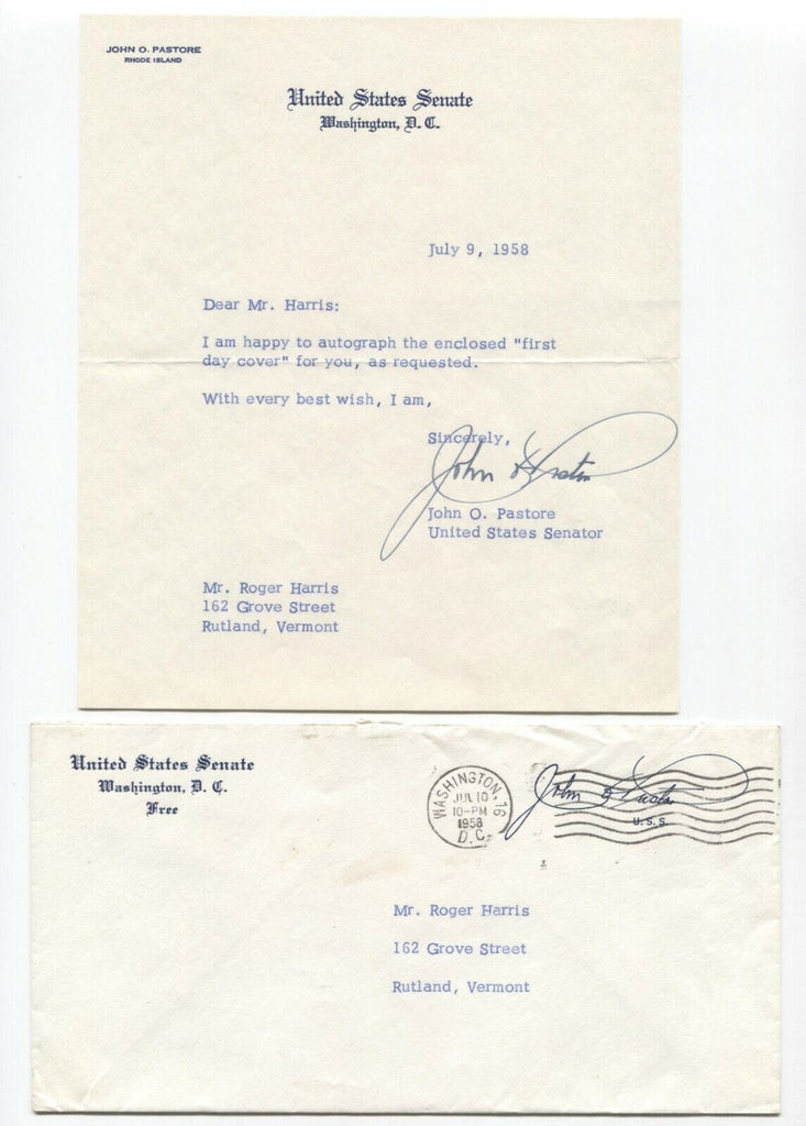 Up for sale is a signed letter, boldly autographed by former Senator and Governor John Pastore.  Autograph was part of the well known single owner, original "Roger Harris" collection of thousands of autographs, acquired over many decades of collecting.