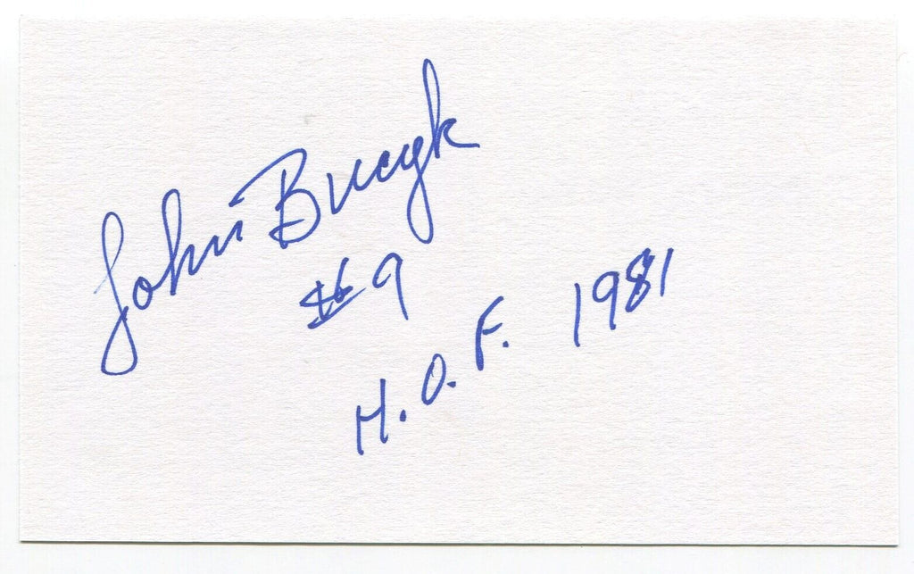 Up for sale is an autographed 3x5 index card, boldly signed by hockey Hall of Famer Johnny Bucyk. Just a great looking autograph that will display nicely.   Autograph was part of a huge "MP" Collection, consisting of over 3,000 signed index cards that I was fortunate to purchase in it's entirety.