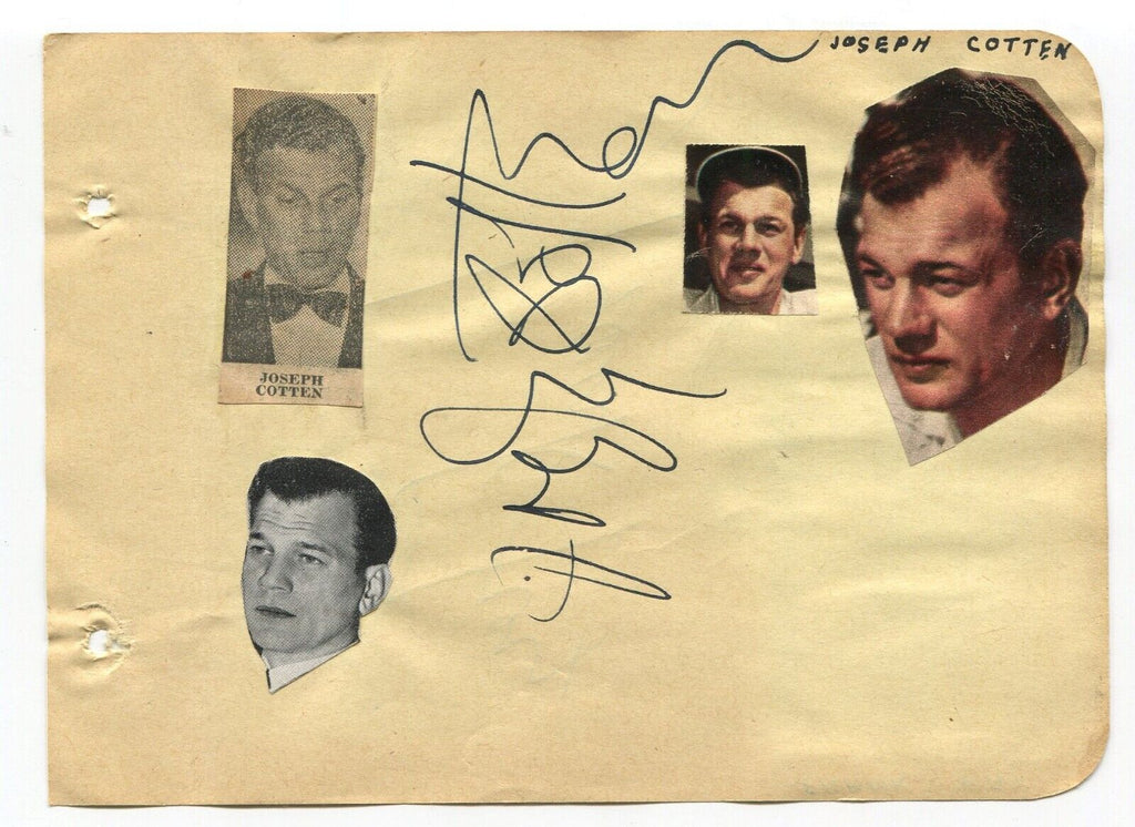 Up for sale is an autographed album page, boldly signed by actor Joseph Cotton. Signed on reverse by Frank Fay. Just an absolutely beautiful signature, on an approximately 4 x 6 inch album page. The album page originates from the "Frank Monteleone" collection, which encompasses seven autographs books and over 800 total signatures. The third scan shows the specific autograph book that this signature was in, the leather cover itself is of course not included). Over the coming weeks, we will be listing the autographs in this collection for sale individually, and there are some truly stellar names and real rarities. We will be listing autographs of Walt Disney, Frank Sinatra, Hattie McDaniel, Three Stooges, Louis Armstrong, Alfred Hitchcock, Elmo Lincoln, Bela Lugois, Charlie Chaplin, Mary Gordon, Al Jolson, Rita Hayworth, just to name a few. There are highly uncommon names from Hollywood in the 1940's and 1950's, with scarce examples of actors from the great films like Gone with the Wind, It's a Wonderful Life, Casablanca, and many of the era's Horror films, etc. This collection is 100% authenticity guaranteed by our company Authentic Trading Post, which we stand behind. Please save us as a seller to follow along and keep an eye out for these autographs in the coming weeks. If you have a specific autograph want list with some tough names that you have been hunting for, I can take a look at see if we have them and get those ones listed for sale soon.