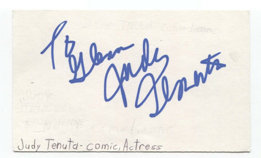 Up for sale is an autographed 3x5 index card, boldly signed by comedian Judy Tenuta. This autograph was part of an enormous collection of over 9000 in person collected signatures.