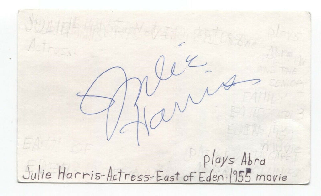 Up for sale is an autographed 3x5 index card, boldly signed by Julie Harris. Autograph was part of an enormous collection of over 9000 in person collected signatures.