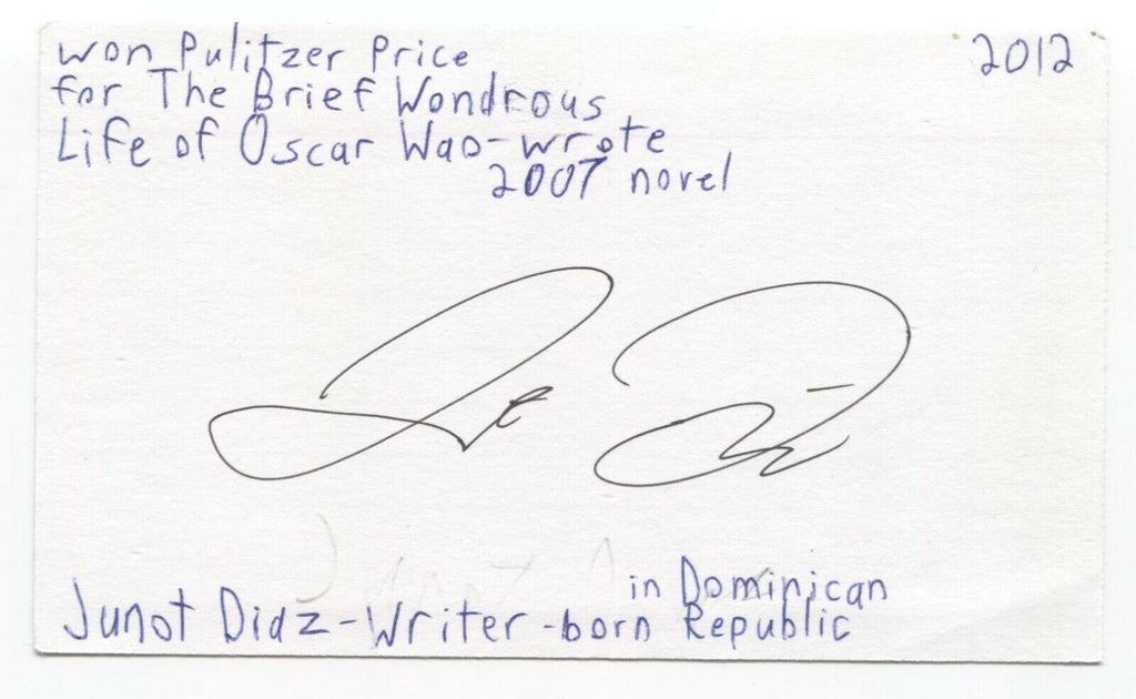 Junot Diaz Signed 3x5 Index Card Autographed Signature Pulitzer Prize Author