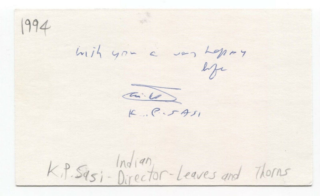 Up for sale is an autographed 3x5 index card, boldly signed by K.P. Sasi. Autograph was part of an enormous collection of over 9000 in person collected signatures.