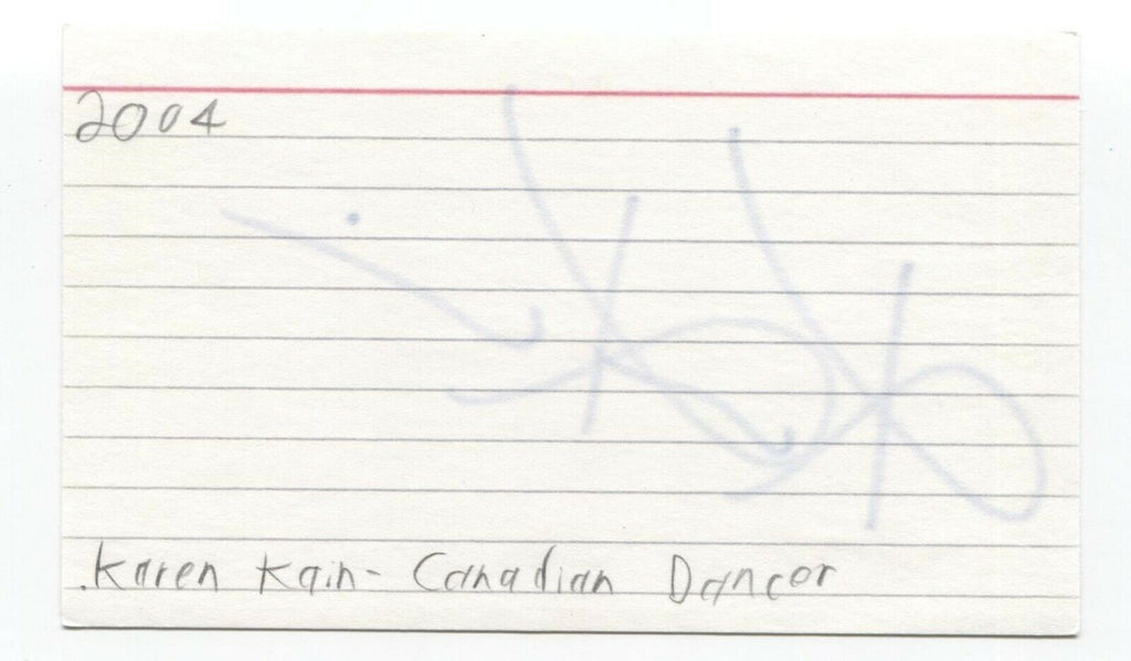 Up for sale is an autographed 3x5 index card, boldly signed by dancer Karen Kain.