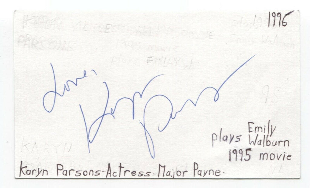 Up for sale is an autographed 3x5 index card, boldly signed by actress Karyn Parsons. This autograph was part of an enormous collection of over 9000 in person collected signatures.