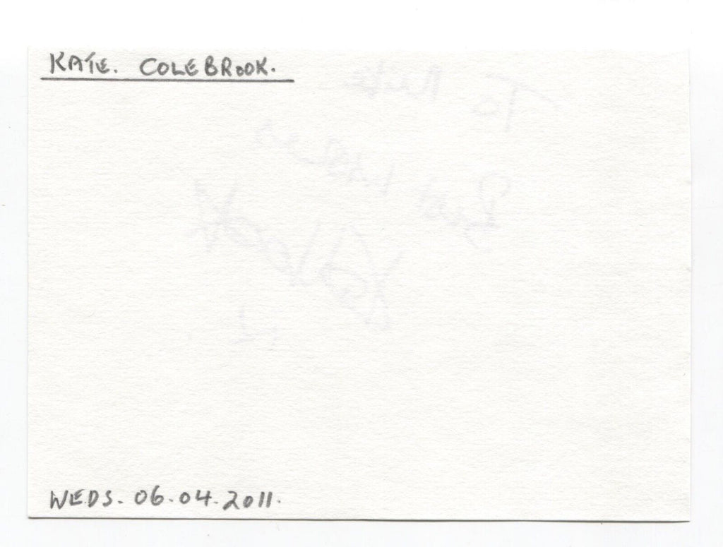 Originating from the "Michael Berry" autograph collection, this thick white paper page features a bold and clear purple pen autograph of Kate Colebrook. Page itself measures approximately 5.5 x 4 inches in size.