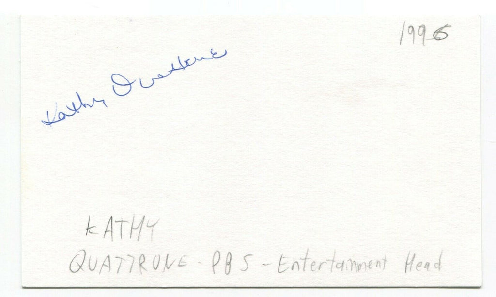 Up for sale is an autographed 3x5 index card, boldly signed by former PBS Program Director, Kathy Quattrone.  Autograph was part of an enormous collection of over 9000 in person collected signatures.