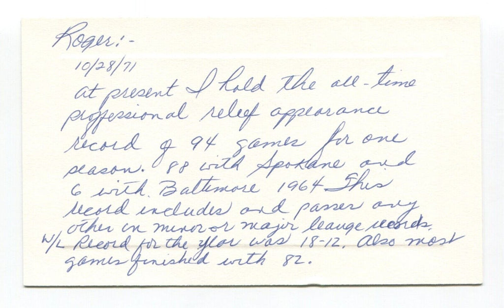 Up for sale is an autographed approximately 3.5 x 5.5 inch card, boldly signed by baseball player Ken Rowe. Just a great looking autograph that will display nicely. Autograph was acquired by renowned autograph collector Roger Harris.