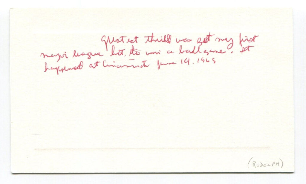 Up for sale is an autographed approximately 3.5 x 5.5 inch card, boldly signed by baseball player Ken Rudolph. Just a great looking autograph that will display nicely.   Autograph was acquired by renowned autograph collector Roger Harris.